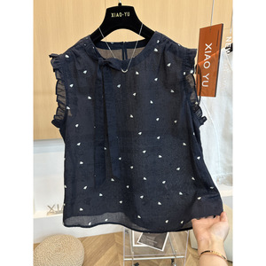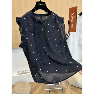 高端欧货夏季新款洋气时尚爱心印花绑带木耳边无袖背心衬衫上衣女