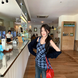 实拍 2025早秋时尚复古格子背心上衣+长袖针织短开衫外套女86721