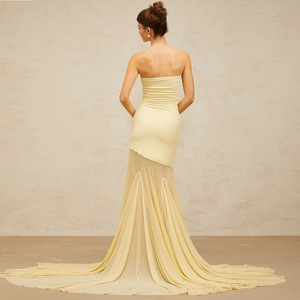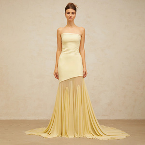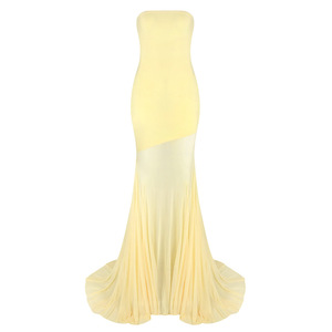 欧美新款温柔风淡黄色冰丝网纱拼接抹胸连衣裙女大裙摆修身包臀裙