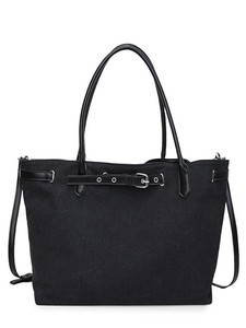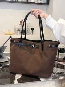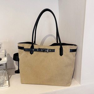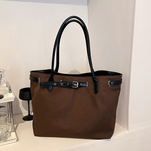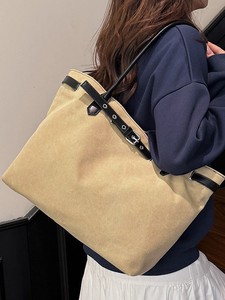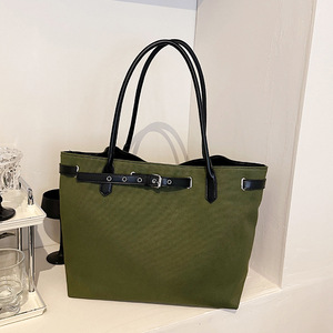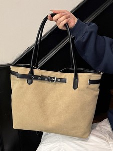 韩版简约帆布托特包大容量皮带扣慵懒风休闲拼接撞色手提单肩大包