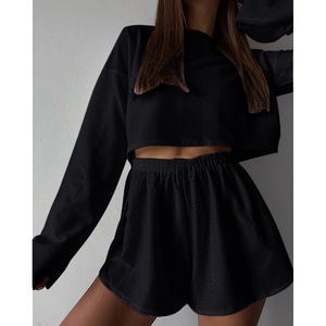 跨境女士休闲пижама套装镂空时尚简约宽松套头长袖上衣短裤