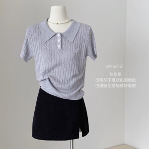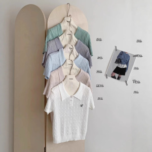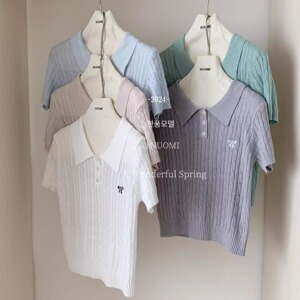 韩系纯色翻领蝴蝶结针织T恤短袖女夏季新款宽松百搭减龄防晒衫