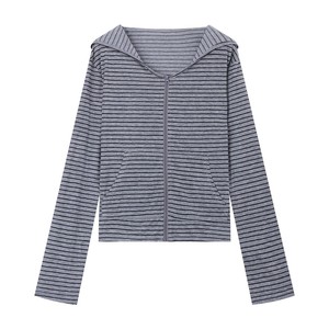 慵懒风条纹拉链长袖连帽开衫外套女夏季短款百搭休闲防晒罩衫上衣