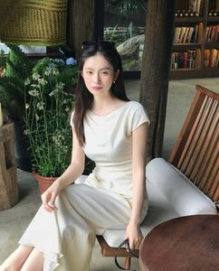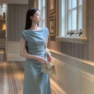 西遇荡领短袖连衣裙女2025年夏季新款法式掐腰褶皱薄款连身长裙