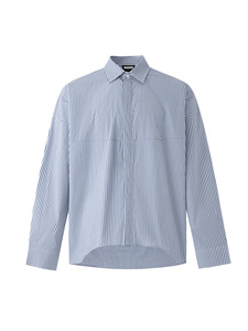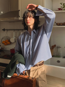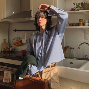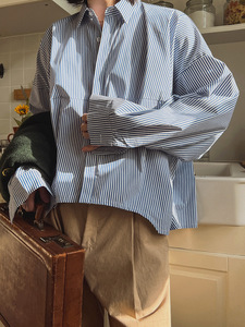 MYQ条纹短款休闲衬衫男士秋季宽松长袖衬衣韩系设计感小众穿搭