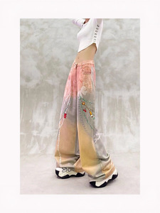 个性数码印花水洗休闲牛仔裤女夏新款高腰宽松显瘦百搭直筒阔裤