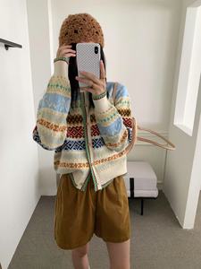 韩系清新风菱形条纹撞色针织开衫毛衣女秋冬新款韩版针织上女上衣