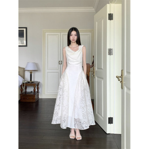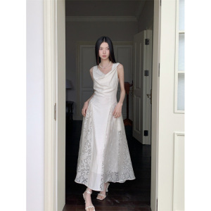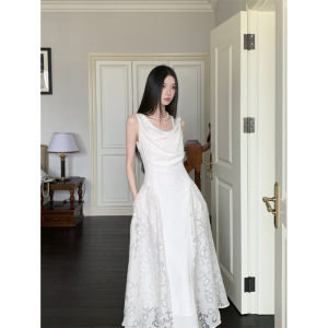 实拍现货夏季白月光小白裙子复古荡领蕾丝一字肩连衣裙