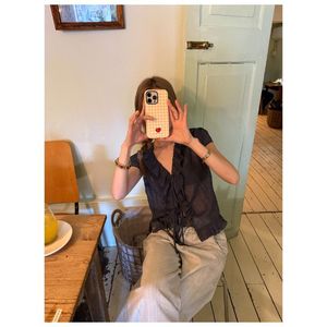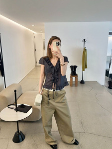 冷感压皱灰蓝格纹 轻薄防晒荷叶边短袖衬衫设计感休闲气质上衣女