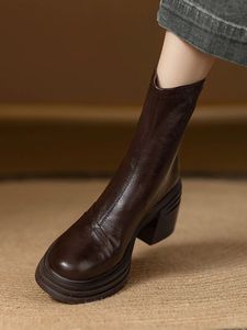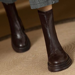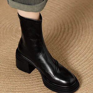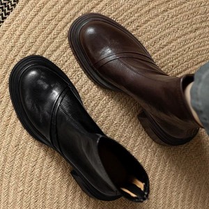 牛皮版·厚底增高小个子高跟黑色短靴女圆头加绒秋冬瘦瘦靴马丁靴
