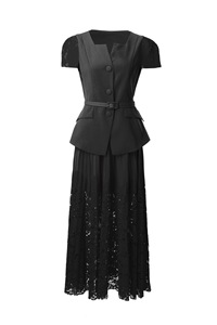 欧美风女装2025年夏季套装方领蕾丝上衣百褶裙摆松紧腰优雅套装