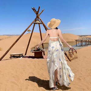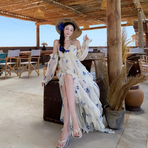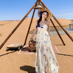 2025高级法式碎冰蓝鸢尾夏日蓝玫瑰露背吊带连衣裙可拆卸袖长裙
