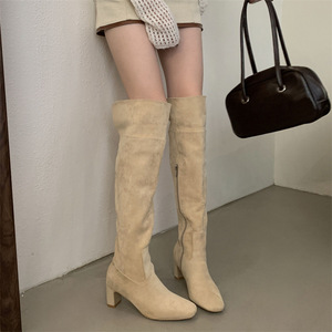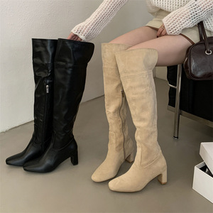 2025复古翻折两穿高筒长靴女气质双色翻领过膝高跟侧拉链瘦瘦长靴