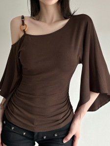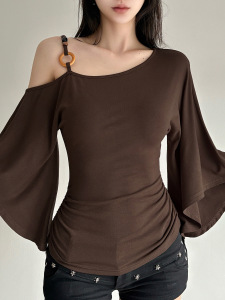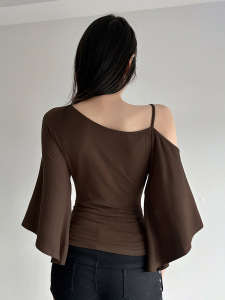 废土风纯色宽松斜肩吊带T恤女2025美式辣妹喇叭袖ins新款打底上衣