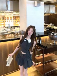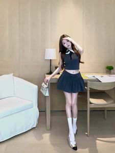 miu系高知穿搭套装撞色娃娃领无袖背心女夏季蝴蝶结半身裙两件套