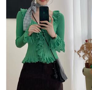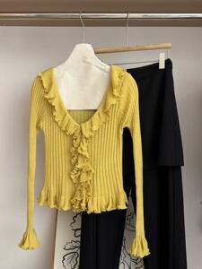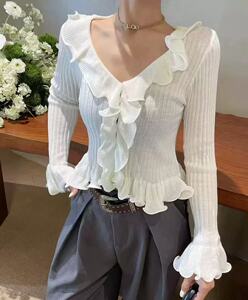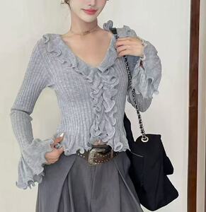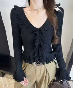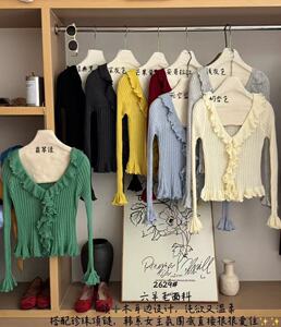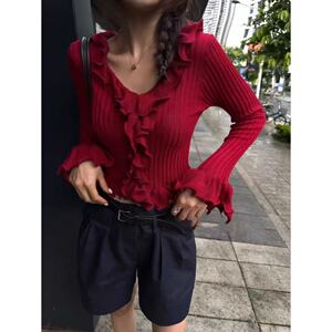2025法式纯欲气质木耳边修身显瘦V领针织女早秋别致独特小众上衣