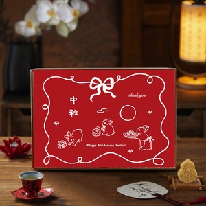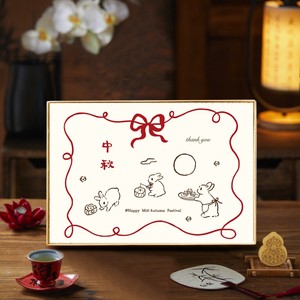 4格天地盖空木盒+水墨兔子包装纸+手绘中秋卡片+米色皮绳+随机吊牌+别针+红色铃铛+金色葫芦一个外