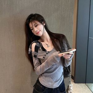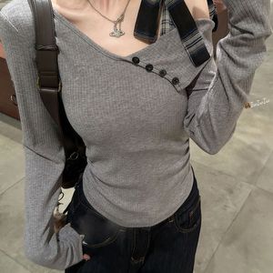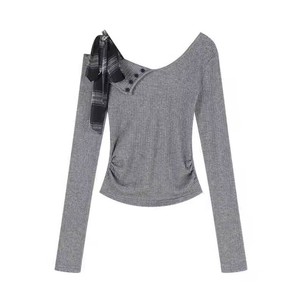 甜辣简约休闲百搭设计感小众蝴蝶结系带长袖T恤女不规则露肩上衣