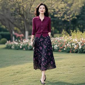 春秋季穿搭一整套气质休闲高级感中年妈妈针织衫碎花半身裙两件套