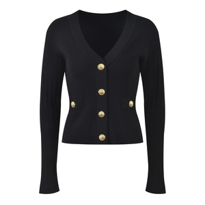 2025秋季新款法式小香风V领金属扣修身撞色百搭长袖针织开衫上衣