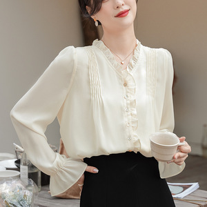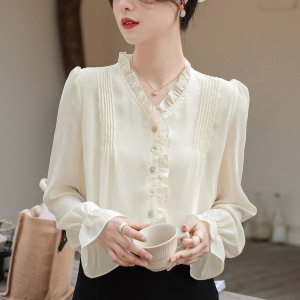 法式褶皱V领木耳边喇叭袖雪纺衬衫女2025秋季新款时尚气质小衫 潮