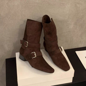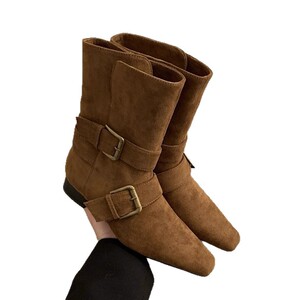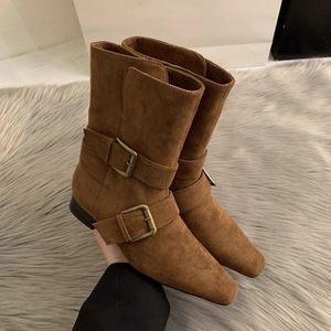 牛皮版~韩版法式低跟短靴女新款小众设计绒面方头粗跟中筒马丁靴