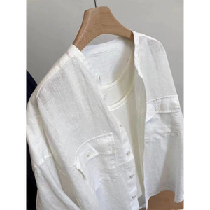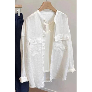 初秋日系2025新款小个子白色棉麻衬衫女薄款立领长袖百搭开衫上衣
