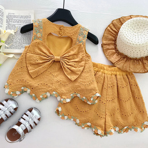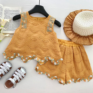 女童新款无袖套装2025夏季时尚洋气刺绣花朵镂空上衣短裤两件套潮