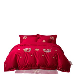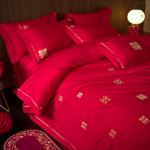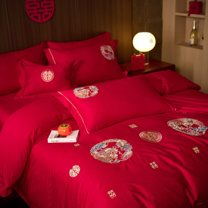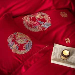 龙凤誓言|中式婚礼婚嫁囍龙凤刺绣长绒棉四件套红色纯棉陪嫁套件
