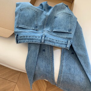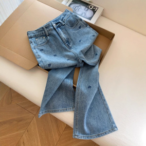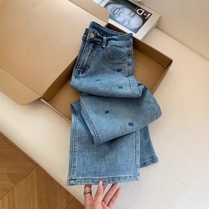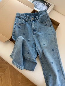 玫瑰刺绣烫钻设计感浅色窄版直筒软牛仔裤阔腿宽松长裤子女夏薄款