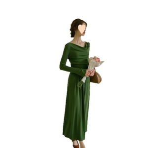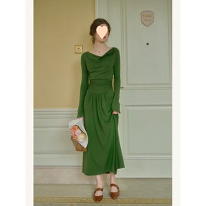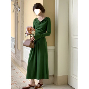 立体玫瑰绿色荡领针织连衣裙女春季长袖法式显瘦长裙子