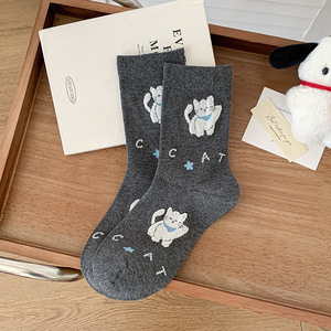 植绒小猫袜子女2025秋季新款可爱卡通中筒袜ins潮条纹堆堆袜无骨