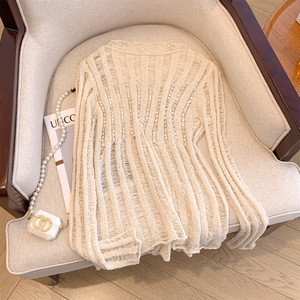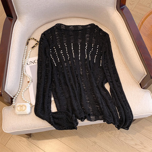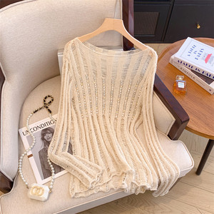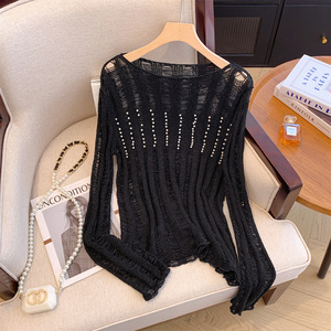 广州十三行高货爆款~新款串珠镂空薄款镂空长袖针织宽松显瘦上衣