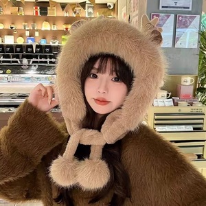 新款灵动狐狸耳帽子女秋冬季骑车保暖防寒毛绒帽子围巾一体二件套