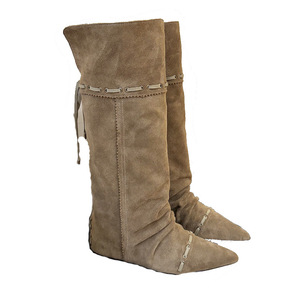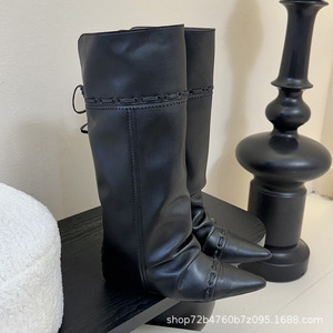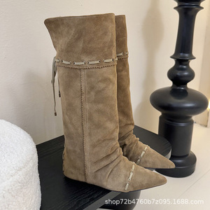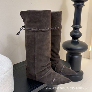 牛皮版~2025秋冬新款尖头内增高长筒靴女褶皱两穿西部牛仔堆堆靴