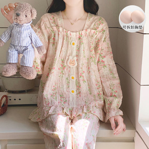 云朵棉睡衣女带胸垫春秋季新款公主风碎花长袖长裤宽松家居服套装