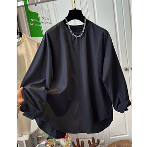 春秋法式高级感别致圆领后背开叉长袖衬衫上衣女大码宽松休闲气质
