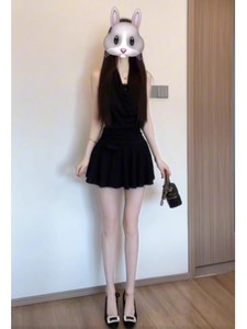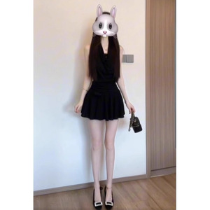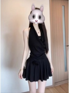 【暗夜精灵】黑色辣妹纯欲风假两件蕾丝连衣裙女纯欲修身挂脖裙子