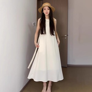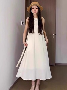 米白色【白色连衣裙/小白裙/无袖连衣裙/赫本风/气质名媛女神范感/设计感小众/初恋清纯奶甜/小个子/