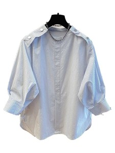浅蓝色条纹衬衫女装2025新款早秋宽松百搭圆领套头中袖七分袖上衣