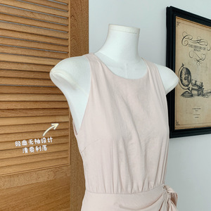 2025夏季新款 简约U领无袖空气感亚麻绑带连衣裙3色纯色长裙
