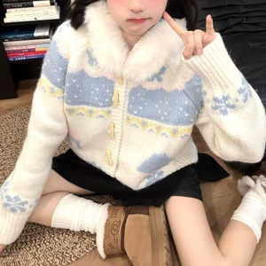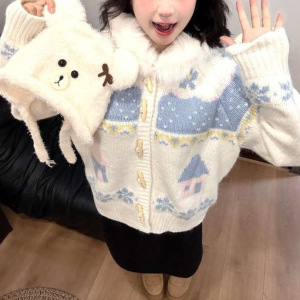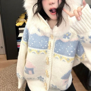 慵懒风费尔岛毛衣外套女秋冬牛角扣毛领连帽针织开衫宽松甜美上衣