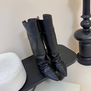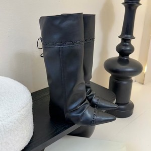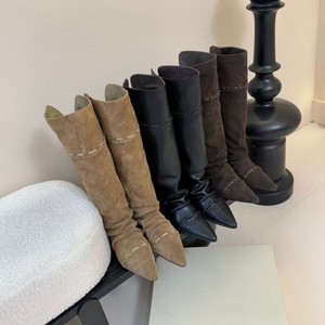 真皮尖头长筒骑士靴子女2025早秋新款宽筒翻折两穿褶皱堆堆靴女士