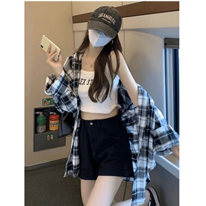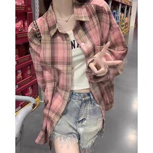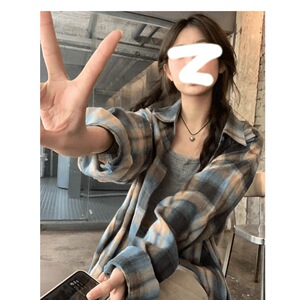 复古宽松慵懒风格子衬衫女早秋新品韩版休闲简约长袖外搭通勤小衫