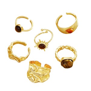 跨境金色琥珀眼石开口戒指女小众设计时尚复古食指戒轻奢戒指套装