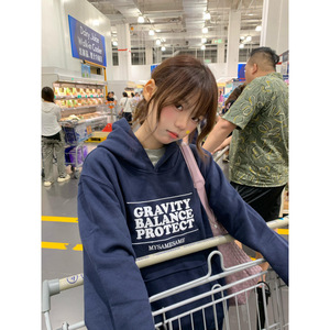美式复古连帽卫衣女早秋字母印花藏青色薄款帽衫外套宽松情侣上衣