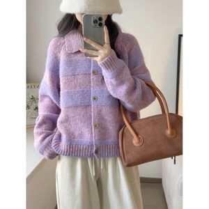 紫色翻领针织开衫女春秋2025新款软糯高级感撞色宽松减龄毛衣上衣