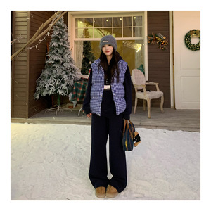韩系复古蓝色格子立领无袖百搭棉服马甲背心女秋冬季加厚棉衣外套