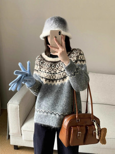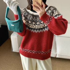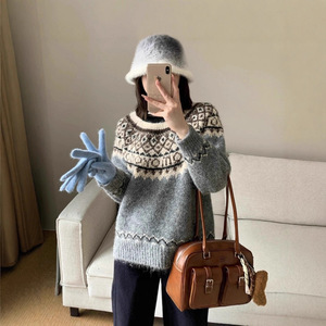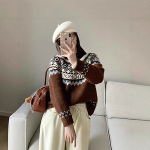 韩系秋冬新款复古费尔岛风套头毛衣女氛围感提花撞色针织女上衣
