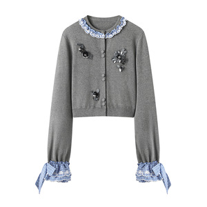 现货2025秋新款时尚格子拼接钉珠刺绣针织开衫FF25Q31ZM093